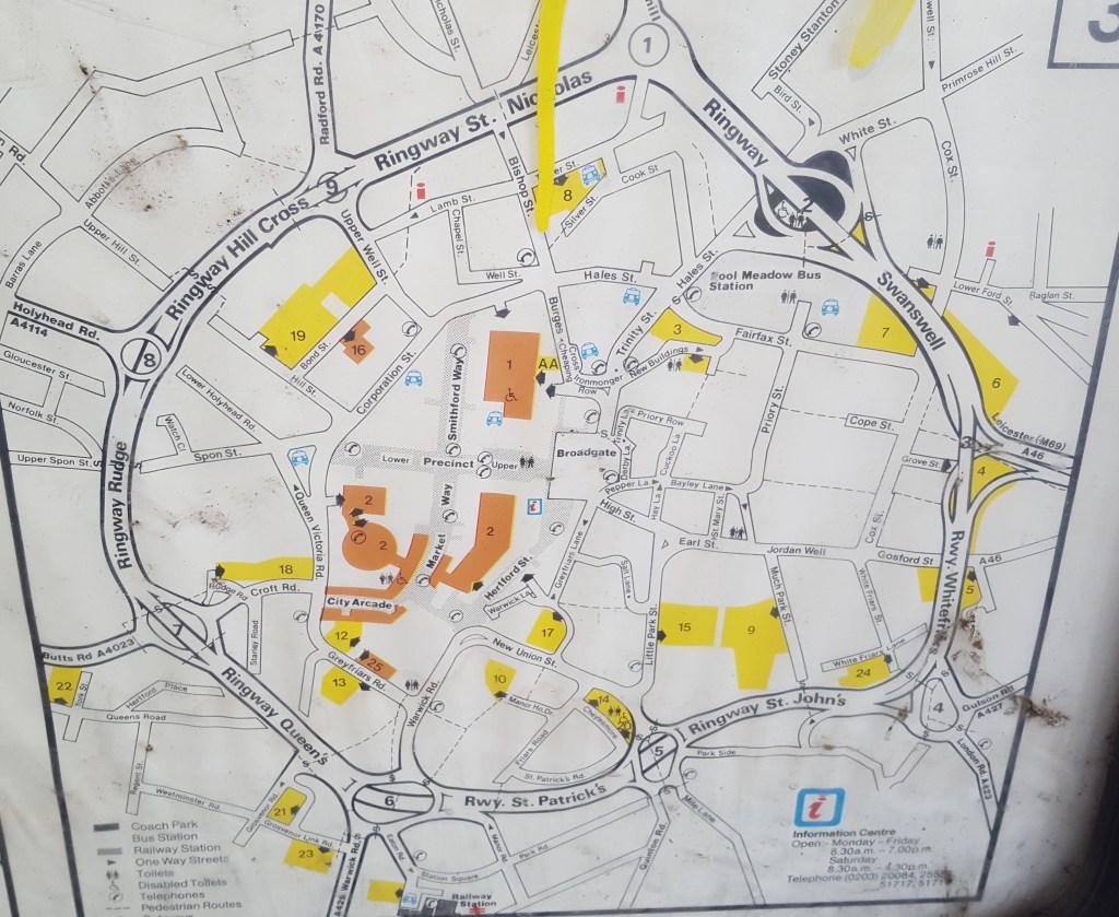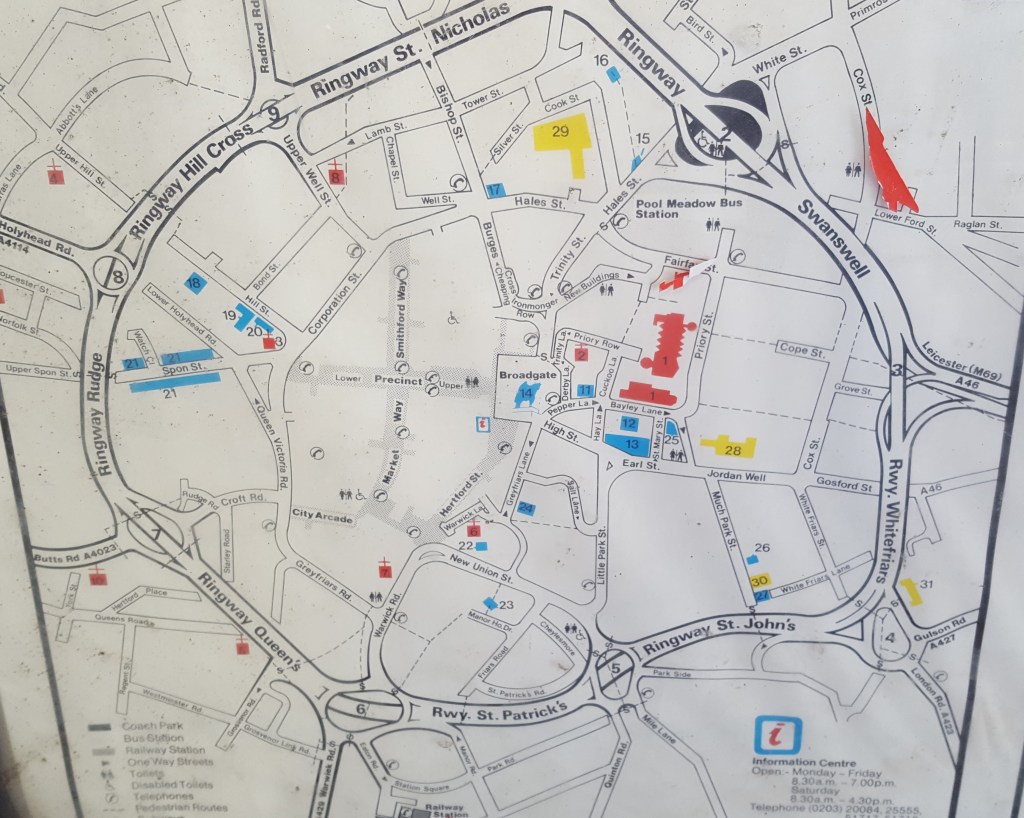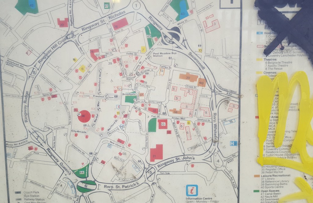 Because what has happened here is that the failure to replace this map for over thirty years, for whatever reason, has created a genuine historical artifact: a snapshot of what Coventry was like, or at least what was considered to be of interest to visitors in the 1980s. If it had been replaced when it became out of date, it would have long since turned to ash in the London Road incinerator.